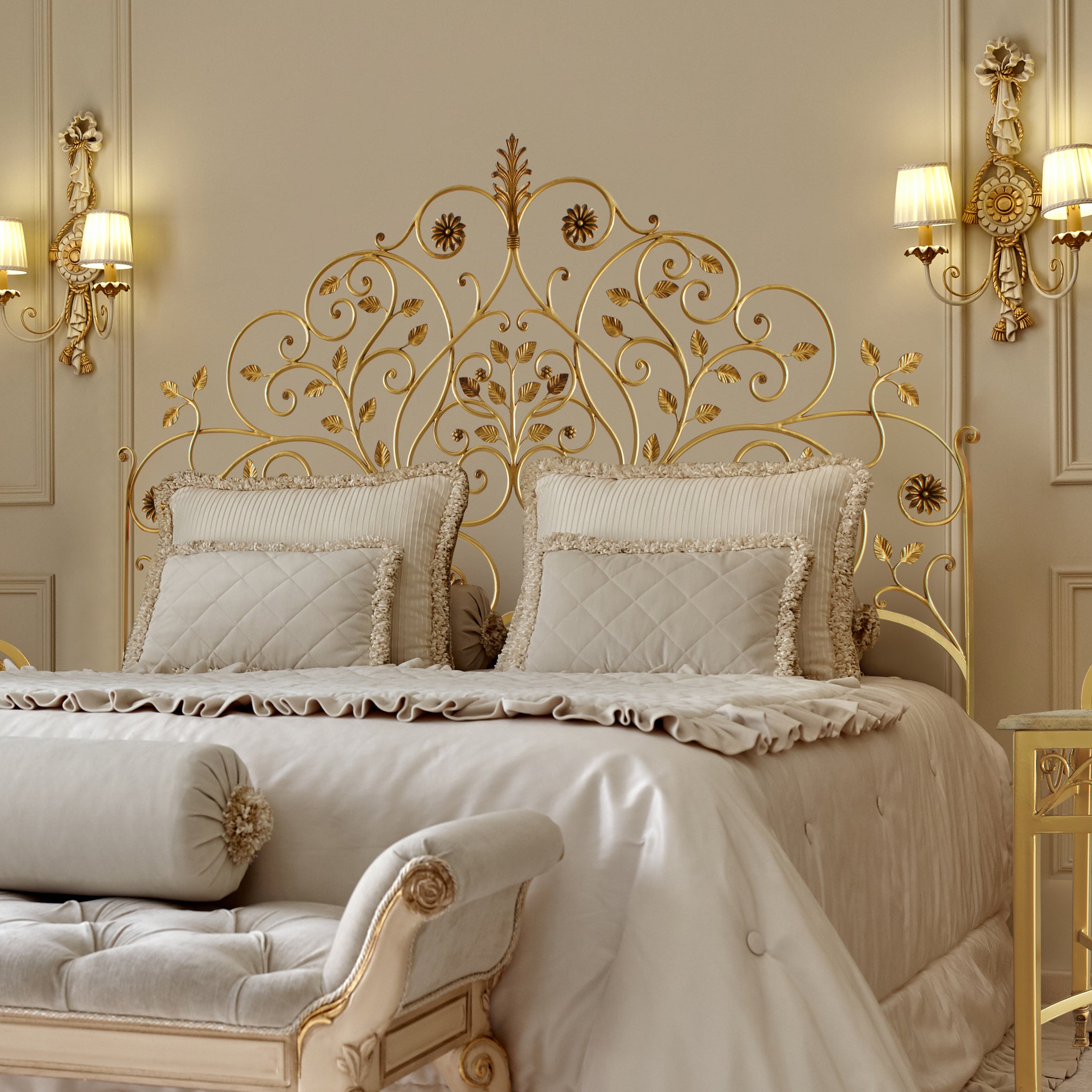 Elegant Primavera bed in antique gold featuring a floral wrought iron design. Luxurious, durable, and perfect for classic and romantic bedroom interiors.